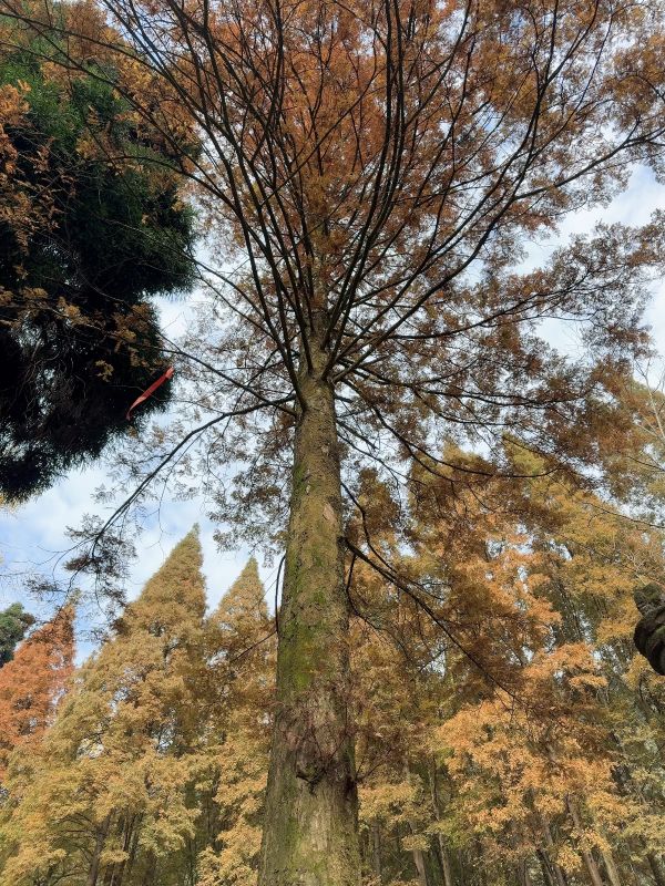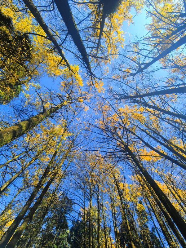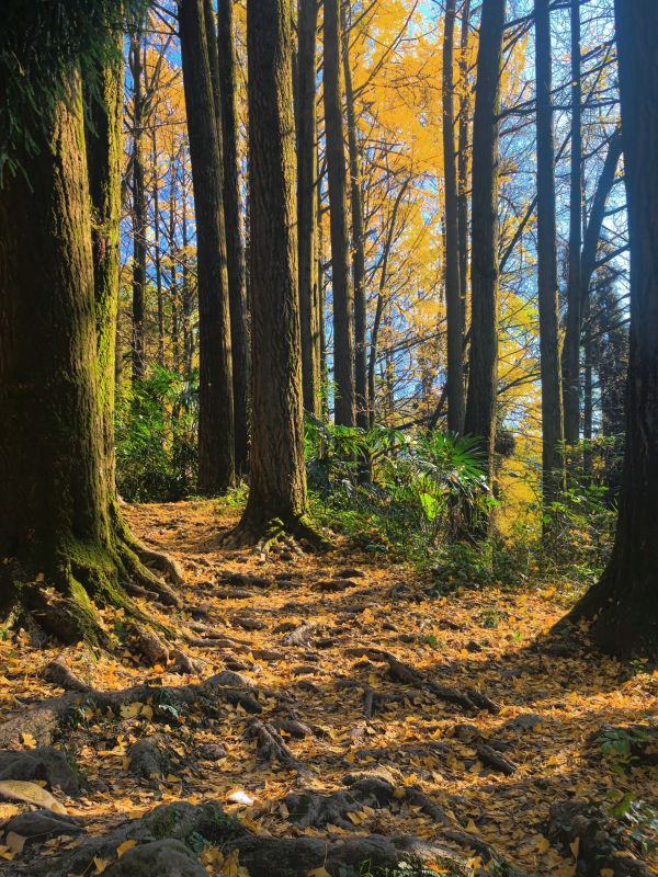 两旁山林中金黄的银杏叶与其他常绿树种相互映衬