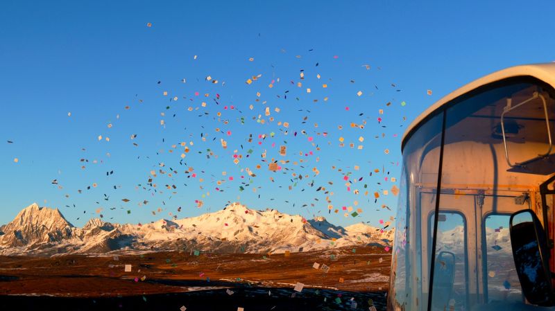 折多山上随处可见由艳丽的经嶓组成三角形或四方形的众多旗阵,在风中招展,密密麻麻,据说经幡是由风读经于佛祖之耳,风雨中,是藏民的虔诚和祈祷在回响。