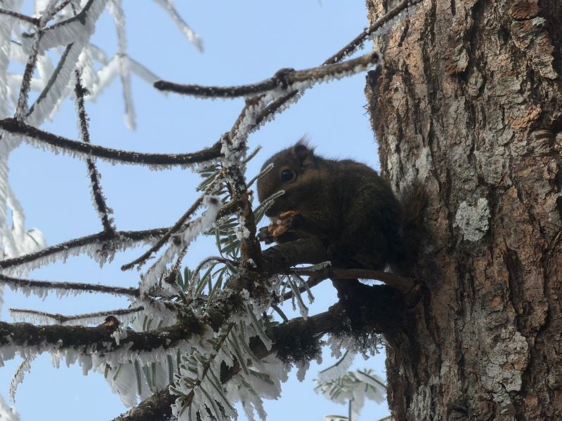 冷杉林海被白雪覆盖,满覆银霜,形成成片的雪凇雾凇。偶有小动物穿林而过,撞落枝丫的雪块,蹭一身雪再逃走。