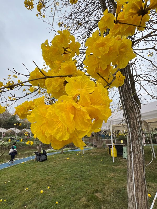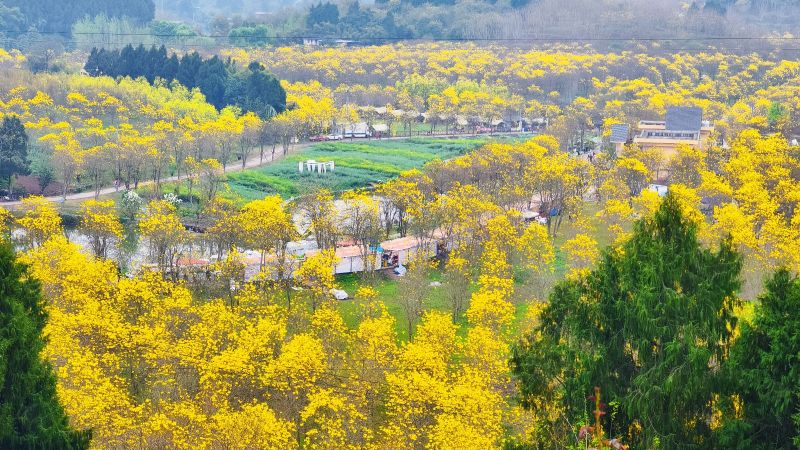 黄风铃木,为巴西国花,是一种随着四季变化而更换风貌的树木,花期只有10-15天,花一开便叶子迅速凋落,所以留的一树繁花无叶。简阳这处秘境宝藏线路便有高达1800亩的风铃哦!