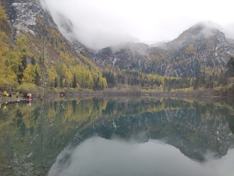 雪山、湖畔的彩林倒影在纯净的湖水中,仿佛水下也有另一个世界。