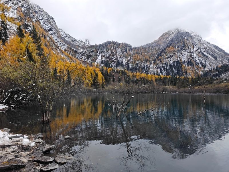雪山、湖畔的彩林倒影在纯净的湖水中,仿佛水下也有另一个世界。