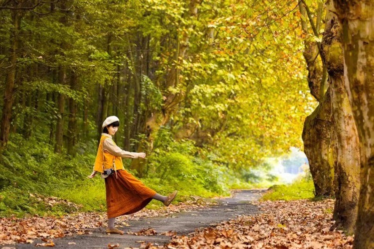 焦糖色的梧桐叶飘洒下来,铺满了整条道路,氛围感直接拉满。